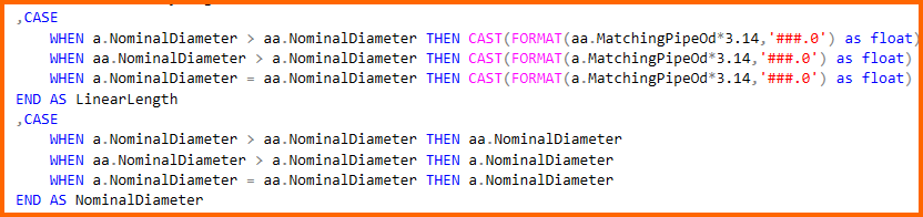 - Using CASE Statements: Transform Tap data to extract port sizes based on port names and joint types using CASE statements. Use [NominalDiameter] but switch to [MatchingPipeOD] for accurate calculations.