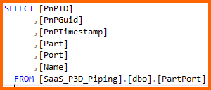 - Extracting Branch Sizes on Olets: Locate the olet branch size on Port2, or S2 under the [Name] column in the [PartPort] table. Once the [PartPort].[PnPID] has been collected, use it to extract port properties like [Port].[NominalDiameter].