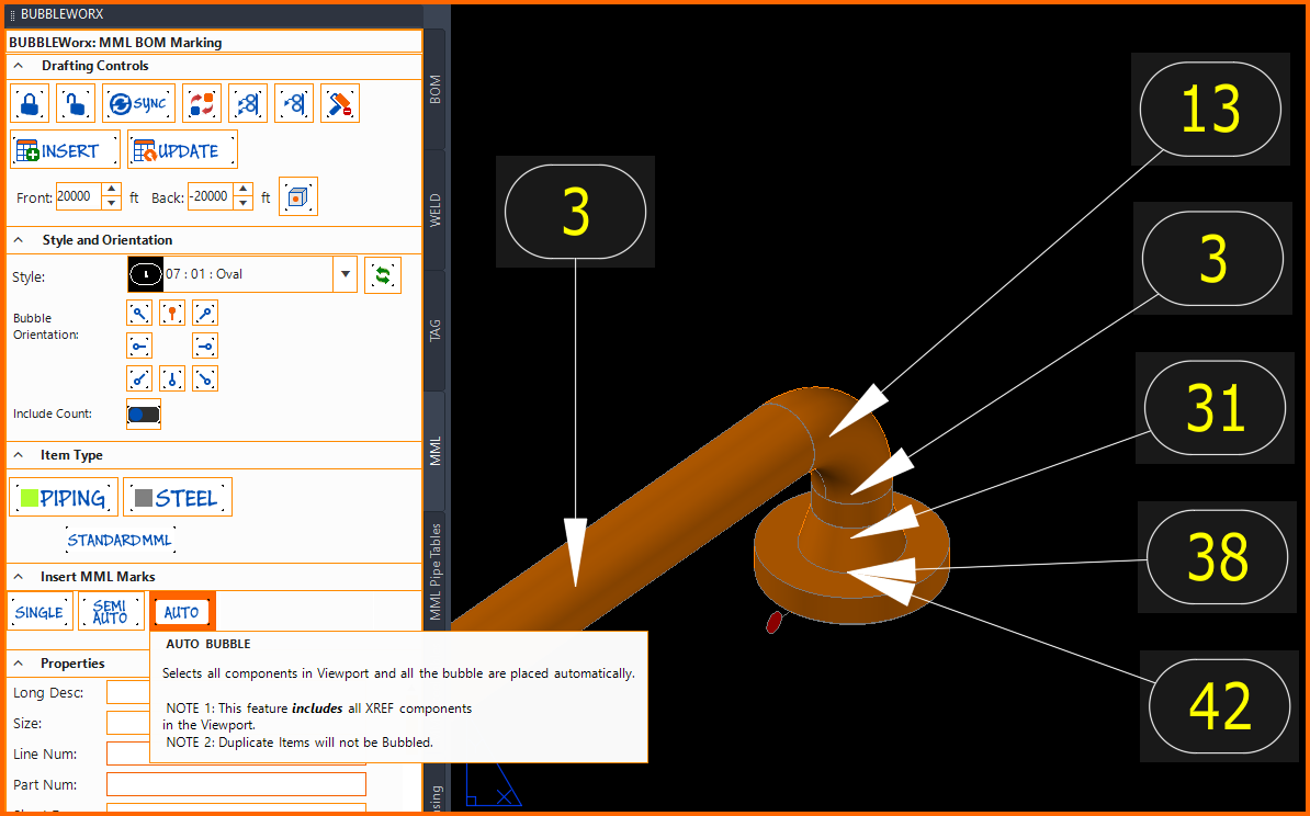 This is done by comparing AutoCAD's unique identifiers. Bubbles become orphans when parts are erased or replaced. Missing AutoCAD external drawing references could also be missing. All these cases will cause the MML MLeader to become RED and Values ORANGE.