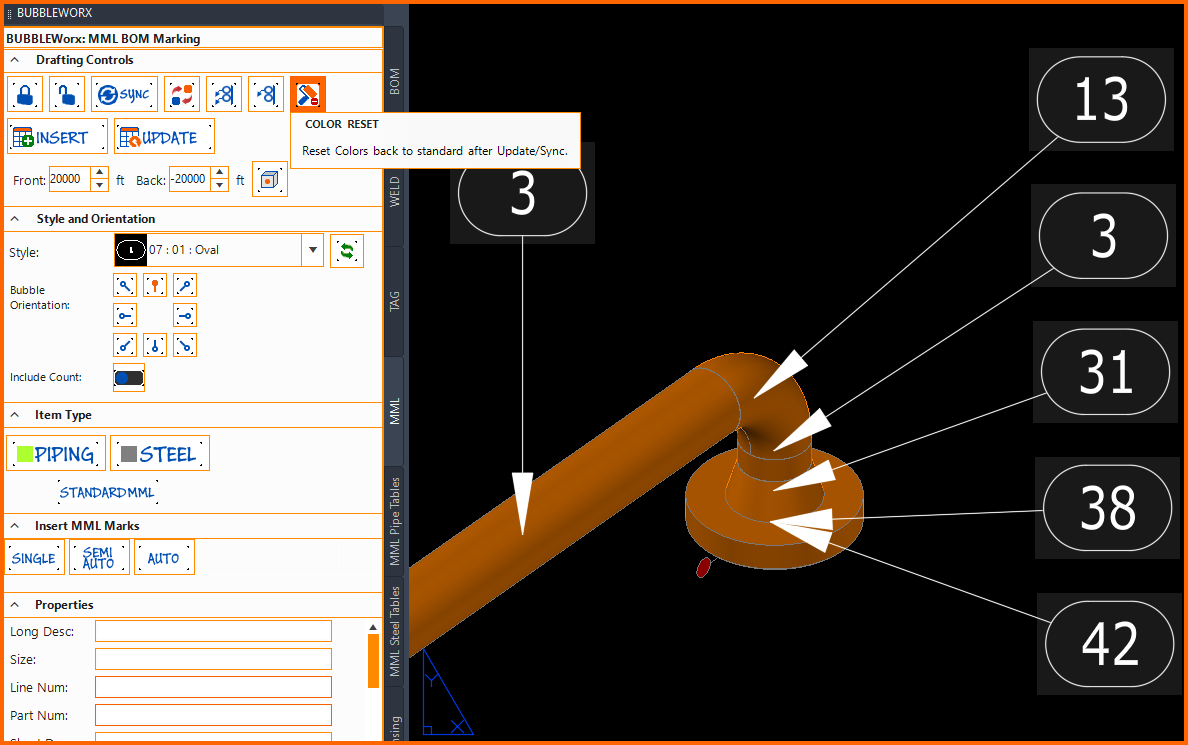 After initial bubble insertion, the Color Reset button sets all MML bubble values to the default values defined in the MLeader and Worx Plugin settings.