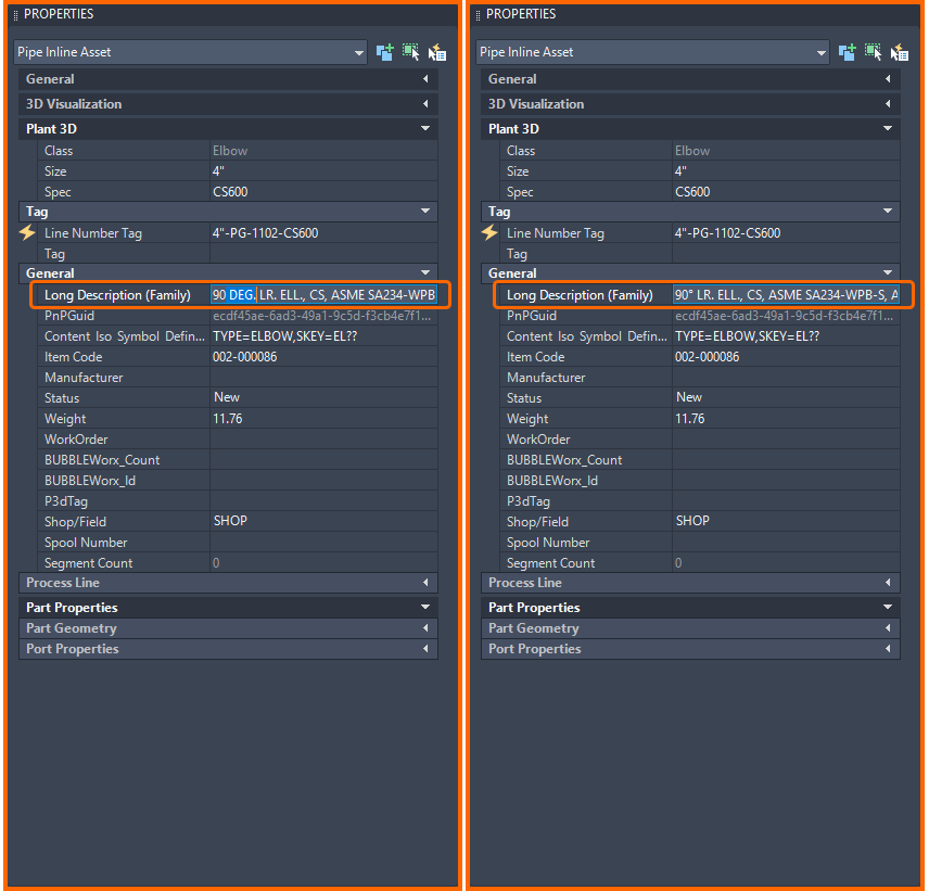 After parts have been marked, BUBBLEWorx inspects the original part descriptions against model descriptions. In this case, the part Long Description (Family) was changed.