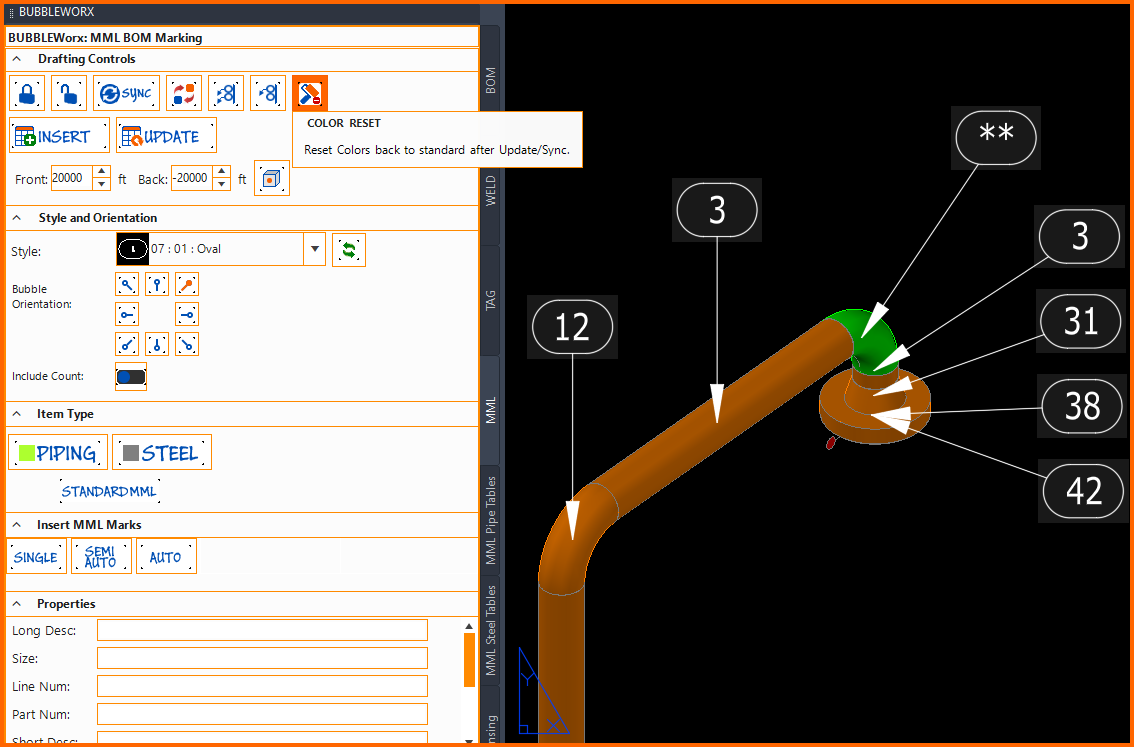 MML Bubble values are inserted into the layer set under the Worx Settings, but its color is set to YELLOW. This color will persist until the Color Reset command is executed. All bubble MML values will change from YELLOW to the layer and block attribute settings.
