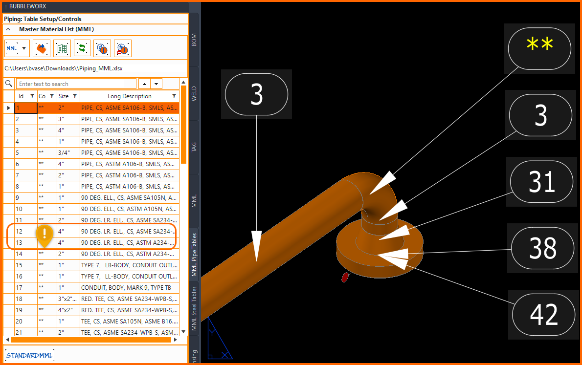 MML Bubble values will populate with two asterisks and set their color to YELLOW. This indicates that the MML Table does not contain a row where size and description match.